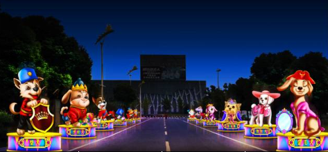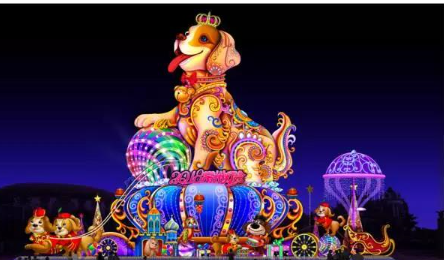 2018年是农历丁酉狗年,今天的生肖主灯以皇冠马车作为设计背景,形态各异的小狗,显得兴奋不已,美丽的城堡凸显出浓郁的欧式风情,金狗小丝驱使着马车,玩转着魔法彩球,前往国王的庆典。