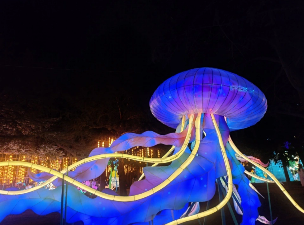 海洋奇缘,梦幻启航: 漫步星光海岸线,感受“鲸奇夜航”灯组的磅礴,巨型发光鲸鱼在光影海浪中遨游;“水晶宫探秘”灯组则以奇幻色彩还原海底世界,展现花灯制作的精细与灵动。